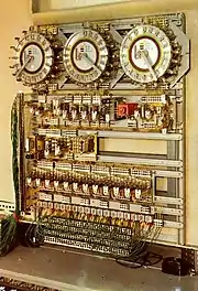 Until the 1960s, FRABA's main product was the mechanical relay. In 1960 FRABA modified their production and started manufacturing the first mobile dialysis system for hospitals. They continued to produce relays as well, such as specific systems for the German railway and relay combination systems for traffic lights.[7] An example of the latter was the manufacturing of the relays for the traffic lights of Haifa in 1962. In February 1962, a large fire damaged the office and the production space of FRABA at Cologne-Niehl. However, this was not the end of the production: in 1963 FRABA launched their first (brush) absolute rotary encoder - a product which would remain the main business. In 1968, the company celebrated 50 years of FRABA and was thriving with 400 employees. In the same year, Franz Baumgartner retired at the age of 80. Two nephews took over the company. In 1969, Franz Baumgartner received the Federal Cross of Merit (Bundesverdienstkreuz), in honour of his work for the disabled and severely ill.[8] Franz Baumgartner proved his high technical skill and knowledge, innovative character and entrepreneurial awareness.[9][10]