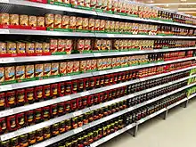 In the retail industry, facing (also known as blocking, zoning, levelling or dressing) is the practice of pulling products forward to the front of the display or shelf on which they are placed, typically with the items' labels facing forward.[1] This is done to keep a store appearing neat and organized, and can help create the illusion of a perfectly stocked store.