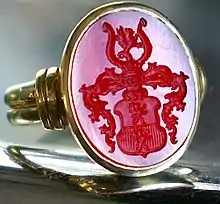 Originally from Hesse, they are direct male-line descendants of the Reginarids and therefore one of the oldest still existing noble families in Europe. They carried the titles Knight, Lord, Count and Freiherr of different dominium plenum and dominium directum. This noble family thrived in the Middle Ages between 1300-1600 and had branches in Hessen, Saxony, Pommern and Westphalia (County Mark and Fbd. Münster) Falken.[3] The coat of arms this family used in Hessen and Thüringen and Saxony