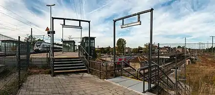 The stairways from the platforms to the pedestrian tunnels have become unusable since the closure of the platform tunnels. Hopes that the town of Falkenberg would be able to preserve the tunnel were not fulfilled because the heritage listing includes only the platform equipment.[19] The level crossing barrier post 4a on Uebigauer Straße north of the platforms had already lost its original function at the end of the 19th century with the construction of the overpass.