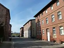 From 1897, a cooperative built, with the help of a loan, tenement-like houses in several streets west of the station; these included stables, a little garden land and community laundry rooms.[18] This area is now a heritage-listed area as the Eisenbahnersiedlung Falkenberg (Falkenberg railway settlement). In 1912, the manor came into the possession of the municipality, allowing new construction areas to be identified, mainly east of the railway. In the 1920s, more apartments were built and by 1925 Falkenberg had become the largest town in the former district of Liebenswerda with 4,850 inhabitants.[18]
