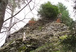 Affected by the economic decline of the low nobility in the late 14th century, it was probably financial pressure that drove the Falkensteins to extend this approach to innocent travellers. This behaviour was the reason that, on 6 December 1388, Freiburg attacked and destroyed Falkenstein Castle.[4] Other historians blame its destruction, however, on Freiburg's hunger for power. The castle chapel apparently survived the demise of the castle. In 1460, it is first mentioned as St. Nicholas' Chapel. In 1606 it was moved into the valley by the Höllenbach stream, today known as the Rotbach.