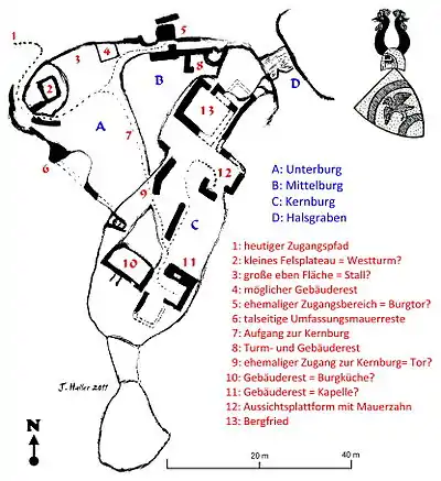 Plan of the Falkenstein castle site. Key: A: Lower Ward; B: Middle Ward; C: Inner Ward; D: Neck Ditch; 1: present access path; 2: small rock plateau = West Tower? 3: large flat area = Stables? 4: possible building remains; 5: former entrance area = Castle Gate? 6: valley-facing remains of the enceinte; 7: ascent to the Inner Ward; 8: Tower and building remains; 9: former entrance to the Inner Ward = Gate? 10: building remains = Kitchen? 11: building remains = Chapel? 12: viewing platform and projecting wall section; 13: Bergfried