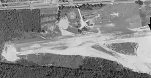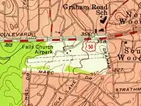 The Falls Church Airpark was a pair of unpaved landing strips located in Fairfax County, Virginia. The license for the airport was granted by the Commonwealth of Virginia on July 25, 1945[4] but the airport was not available for general use until 1946 when it opened with a single grass runway, 2,650' long. The airport was built on an area known at the time as "Eisenhower's Farm" and was located alongside U.S. Route 50.[3][5] A 1949 report, compiled by the state of Virginia, described the airport as being located two miles southwest of Falls Church, and featuring a single strip that was characterized as "...poorly graded and hazardous after rains."[6] By 1951, a smaller, crosswind airstrip was added to the complex. During the 1950s, the airport was used by general aviation, civil defense, medical transportation, and air shows.[7][8][9][10] Pilot training was also offered at the facility[11] and airplane sales and rentals were made available through a Mooney aircraft dealer located on the property. The airpark also hosted a chapter of the Civil Air Patrol squadron, private flying clubs, a small building that contained a Link Trainer for student pilot use, a hangar used for maintenance work, and a converted house that was used as both an office and a snack bar complete with vending machines.[12] Despite the difficulties in landing and taking off due to the slope of the main runway and the restricting tree lines at the field's western end, the airfield was popular with local pilots and at its peak hosted approximately 75 planes.[2]