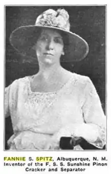 Spitz invented the first practical machine for shelling pine nuts in bulk.[3] She traveled to study nut processing methods, and spent months as an apprentice in a machine shop,[4] before she built a prototype of her original design in her basement workshop. She was granted a patent for the "Method and Apparatus for Shelling Nuts"[5] in 1918.[6] She also sold pine nuts from her Albuquerque farm, and promoted their nutritional value and culinary possibilities.[7] She also exhibited the machine at a national convention of confectioners in 1922, in Chicago.[8] She also experimented with using the machine for processing coffee beans.[9] The Albuquerque Journal declared her "the greatest known authority on the pinon nut and its possibilities".[10] In October 1923, she announced that she was retiring and seeking buyers to take over her business.[11]