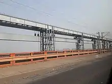 Farakka Barrage is a barrage across the Ganga river located in Murshidabad district in the Indian state of West Bengal, roughly 18 kilometres (11 mi) from the border with Bangladesh near Shibganj. Farakka Barrage Township is located in Farakka (community development block) in Murshidabad district. Construction of the Farakka barrage started in 1962, was completed in 1970 at a cost of $208 million.[1] Operations began on 21 April 1975. The barrage is about 2,304 metres (7,559 ft) long.[2] The Feeder Canal (Farakka) from the barrage to the Bhagirathi-Hooghly River is about 42 km (26 mi) long.[3]