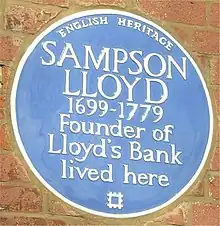 The former 56-acre "Owen's Farm"[3] with an Elizabethan farmhouse[4] in the manor of Bordesley,[5] now in the locality of Sparkbrook, was purchased in 1742 by Sampson II Lloyd (16991779) of nearby Edgbaston Street, Birmingham, an iron-master who later in 1765 co-founded Lloyds Bank. He was descended from the ancient family of Lloyd of Dolobran Hall in Montgomeryshire (now Powys) in Wales. He retained the Tudor farmhouse and built near it "Farm" an eponymous mansion house, which survives as a grade II* listed building known today as "Lloyd's Farmhouse, Farm Park, 139 Sampson Road, Birmingham", one of the most important of the rare surviving Georgian buildings in the city of Birmingham.[6][7] An English Heritage blue plaque is affixed to the building.