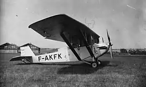 The F.1000 was a high-wing strut-braced monoplane with a large wing area. It had a conventional fixed landing gear and was powered by a 350 hp (261 kW) Farman 8Vi engine.[1] The aircraft first flew on 25 June 1932, piloted by Lucien Coupet.[1][2]