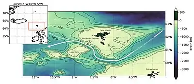 Cold and dense water from the Nordic Seas is transported southwards as Faroe-Bank Channel overflow. This water flows from the Arctic Ocean into the North Atlantic through the Faroe-Bank Channel between the Faroe Islands and Scotland. The overflow transport is estimated to contribute to one-third (2.1±0.2 Sv, on average) of the total overflow over the Greenland-Scotland Ridge.[1][2] The remaining two-third of overflow water passes through Denmark Strait (being the strongest overflow branch with an estimated transport of 3.5 Sv[3][4]), the Wyville Thomson Ridge (0.3 Sv), and the Iceland-Faroe Ridge (1.1 Sv).[1]