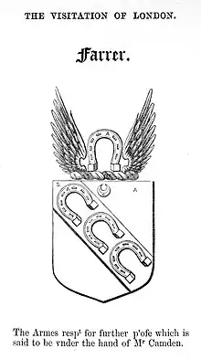 There is an apparent symbiotic relationship between the surname and armorial bearings issued to various houses of Farrar/Farrer/Ferrar, all of which have, on a bend, three horseshoes and some have a horseshoe on the crest. Such as Fairer of Warcorp Tower, Westmoreland[14]:43 And pedigrees recorded in the Visitation of Surrey[15]:157–158 and Visitation of Hertford.[16]:58 The arms of Nicholas Ferrar.[17]