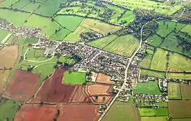 The parish church is a small stone edifice dedicated to St John the Baptist. Originally of Norman architecture, it was rebuilt in Gothic style by John Pinch the younger in 1843.[4] The stump of the medieval cross and a carving over the door survive from an earlier building.[11] The church is set away from the main village in a picturesque location in the middle of a field, originally in order to protect the villagers from the plague.