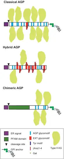 AGPs belong to large multigene families and are divided into several sub-groups depending on the predicted protein sequence.[11][4][12][13][2][14] "Classical" AGPs include the GPI-AGPs that consist of a signal peptide at the N-terminus, a PAST-rich sequence of 100-150 aa and a hydrophobic region at the C-terminus that directs addition of a GPI-anchor; non GPI-AGPs that lack the C-terminal GPI signal sequence, Lysine(K)-rich AGPs that contain a K-rich region within the PAST-rich backbone and AG-peptide that have a short PAST-rich backbone of 10-15 aa (Figure 2). Chimeric AGPs consist of proteins that have an AGP region and an additional region with a recognised protein family (Pfam) domain. Chimeric AGPs include fasciclin-like AGPs (FLAs), phytocyanin-like AGPs (PAGs/PLAs, also known as early-nodulin-like proteins, ENODLs) and xylogen-like AGPs (XYLPs) that contain lipid-transfer-like domains.[1] Several other putative chimeric AGP classes have been identified that include AG glycomotifs associated with protein kinase, leucine-rich repeat, X8, FH2 and other protein family domains.[2][15][16] Other non-classical AGPs exist such as those containing a cysteine(C)-rich domain, also called PAC domains, and/or histidine(H)-rich domain,[17][18] as well as many hybrid HRGPs that have motifs characteristic of AGPs and other HRGP members, usually extensin and Tyr motifs.[17][19][1][2][14] AGPs are evolutionarily ancient and have been identified in green algae as well as Chromista and Glaucophyta.[2][14][20] Found throughout the entire plant lineage, land plants are suggested to have inherited and diversified the existing AGP protein backbone genes present in algae to generate an enormous number of AGP glycoforms.