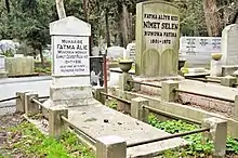 Her youngest daughter Zübeyde İsmet converted in 1926 to Christianity, left Turkey to become a Roman Catholic nun.[4] Fatma Aliye travelled in the 1920s several times to France in search of her daughter and also for her own health reasons.[5] In 1928, she lost her husband. Fatma Aliye adopted the family name "Topuz" after the introduction of the Surname Law in Turkey, which was enacted on 21 June 1934. Having lived her last years in poor health and financial distress, she died on 13 July 1936 in Istanbul.[7] She was laid to rest at the Feriköy Cemetery.