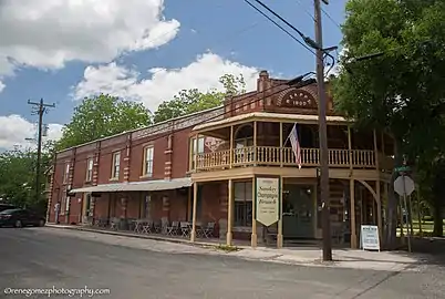 A former precinct courthouse, sits in the town square with extra wide 100-foot (30 m) curbed streets on its borders as specified in the original 1850 plat. Bounded by Main, Washington, Live Oak and Fayette streets the town square is the focus of commercial development. The remainder of the town is primarily residential. Typical commercial construction is wood frame block buildings many featuring false front parapets and awnings. Residential construction is typically modest single family homes on generous lots.[2]