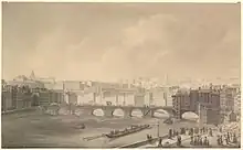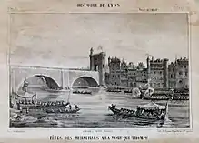The Pont du Change, the only bridge over the Saône at the time, had only one navigable arch (on the Saint-Nizier church side). This only possible passage for boats also featured a rapid nicknamed the "Mort-qui-trompe" (the deceiver). In the Middle Ages, this arch was known as the "marvelous arch", according to the feast.[4]