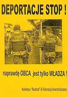 Anarchists from the FA took part in May Day demonstrations against Soviet Poland[26] and organized anti-tax rallies.[27] In the early 1990s in several Polish cities, FA protested against the introduction of religion to schools, and in front of the Sejm they led protests against the passing of the anti-abortion law.[28] In recent years, FA activists have been defending tenants as part of the campaign "Mieszkanie Prawem NIE Towarem" (Apartment [are a] Right, NOT a Commodity), by participating in eviction blockades.[29]