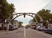 Gateway arch over Atwells Avenue. La Pigna sculpture, a traditional symbol of welcome, abundance and quality, hangs from the center.