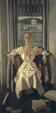 In 1918, "intrigued by the decadent atmosphere of Turin with its sinister views", he settled there with his mother and two sisters.[3] His works of the next decade typify, in their emphasis on geometry and formal clarity, the "return to order" then prevalent in the arts as a reaction to the war. Although many critics found his work cold, cerebral, and academic, Casorati achieved international recognition as a leading figure in this movement.[4] Often working in tempera, Casorati drew inspiration from his study of Renaissance masters, especially Piero della Francesca, as in his 1922 portrait entitled Silvana Cenni.[5] This symmetrical composition of a seated woman in a white dress is perhaps the best-known of the artist's works.[5] In it, the careful rendering of volumes results paradoxically in a sense of unreality which is characteristic of Casorati's art.