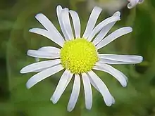 The flower heads sit individually on top of up to 8 cm (3+15 in) long stalks, that may carry few small alternately set bracts. The involucre is up to 12 cm (15 in) in diameter and consists of 2 whorls of bracts. These bracts are all equal in length at about 312 mm (0.14 in) long, the outer lance-shaped, about 1 mm (0.039 in) wide, the inner inverted egg-shaped, about 112 mm wide, with a papery edge, all covered in bristles and glandular hairs. Each flower heads contains about twelve ray florets with a blue strap of about 7 mm (0.28 in) long and 112 mm (0.06 in) wide. These encircle more numerous, yellow disc florets of up to 212 mm (0.1 in) long, those next to the ray florets bisexual and those in the center male. Surrounding the base of the corolla are about ten, quickly discarded, white, protruding bristly pappus bristles of about 112–212 mm (0.06–0.10 in) long. The relatively large, eventually yellowish to reddish brown, dry, one-seeded, indehiscent fruits called cypselae are about 3 mm (0.12 in) long and wide, inverted egg-shaped, the surface and the edge of the otherwise hairless marginal ridges are covered with strong, up to 1 mm (0.04 in) long hairs, while the seedskin is covered in scales. The cypselae of the innermost disc florets are hairless.[3]