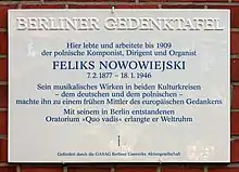 Memorial plaque on the facade of the St. Paul Church in Berlin, in which Nowowiejski was an organist and choir conductor
