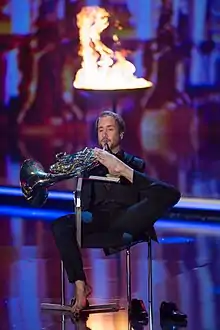Felix Klieser (born 3 January 1991) is a German professional player of the French horn.[1] He was born without arms. He plays the horn by using the toes of his left foot to operate the valves. The horn is held on a tripod. He does not place a limb inside the bell of the horn, in contrast to the way the instrument is traditionally played, using the left hand to operate the valves and placing the right hand inside the bell.