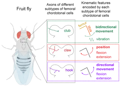 The sensory neurons of the femoral chordotonal organ encode various kinematic features of the femur/tibia joint including, position, speed, acceleration, and vibration.[13][14][15][16][17][18][19] In Drosophila, where it is possible to genetically track different subtypes of femoral chordotonal neurons, it is known that these different kinematic features are encoded by anatomically distinct subtypes of neurons mentioned above[11] (Figure 2). The position of the tibia is encoded by the claw neurons, vibrations are encoded by the club neurons, and the direction of the movement is encoded by the hook neurons.[11]