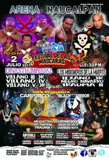 The "Trios" match type (three versus three men tag team matches) became incredibly popular in Mexico in the early 1980s, to the point where the trios match is the most common match on wrestling shows. Two of the teams that helped popularize the Trios matches was Los Misioneros de la Muerte (El Texano, Negro Navarro and El Signo) and Los Villanos (Villano III, Villano IV and Villano V). IWRG's "Festival de las Máscaras" shows is normally their way of paying homage to lucha libre history, which for 2017 meant that they booked versions of those two factions in the main event. El Texano died in 2006,[16] and El Signo retired in 2010, leaving only Negro Navarro as an active competitor. For the Festival de las Máscaras show IWRG brought in El Texano's son, El Texano Jr. and Negro Navarro's son Trauma II to represent the Los Misionero side of the match. Both Villano III and V had retired by 2017, but IWRG had Villano III Jr. represent his father, while Villano V's son Kortiz would fill out the other side for the match.[1]