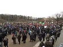 By the mid-2000s, the Field of Mars had become a popular location for demonstrations and protests on issues such as political prisoners, fair elections, anti-corruption measures, etc. This status was acknowledged in December 2012 when the square was designated a "Hyde Park" by the Governor of Saint Petersburg Georgy Poltavchenko, making it a "specially designated place in the city for the collective discussion of socially significant issues and the expression of citizens' public sentiments."[17] A particularly large rally was held on 12 June 2017, attended by over ten thousand people. Police detained 658 people, including Maksim Reznik, a deputy of the Legislative Assembly of Saint Petersburg, and several journalists.[18] In August 2017 Poltavchenko revoked the "Hyde Park" status of the Field of Mars, citing the nature of the burials and memorial made it an inappropriate location for rallies.[19]