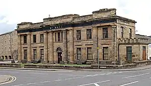 After Waterloo the militia were allowed to decline, and were rarely called out for annual training. The militia ballot was not employed after 1831. The regiments were kept in being by a small and declining cadre of staff and non-commissioned officers.[15] The adjutant of the Fifeshire Militia from 1833 to 1855 was Capt W. Scott, a veteran of the Peninsular War and the Waterloo who had served in the Scots Fusilier Guards. By the 1830s the Regimental Headquarters (HQ) was at Cupar. Lord lieutenants continued to commission officers into the disembodied regiments: both the colonel of the Fifeshire Militia (James Lindsay, appointed in 1835) and his lieutenant-colonel (John Balfour, appointed in 1843) had served in the Grenadier Guards.[12][16] From 1842 to 1895 the regiment used the Old Gaol (built in 1814) at Cupar as its HQ.[17]