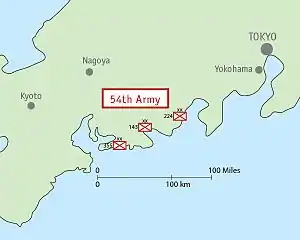The Japanese 54th Army was formed on June 19, 1945, under the Japanese 13th Area Army as part of the last desperate defense effort by the Empire of Japan to deter possible landings of Allied forces in central Honshū during Operation Downfall. The Japanese 54th Army was based in Shinshiro, Aichi Prefecture and was thus intended to guard the approaches and beachheads to Nagoya and the Chūbu region of Japan. It consisted mostly of poorly trained reservists, conscripted students and home guard militia. Most of its units were still in training, and had neither weapons nor ammunition at the time of their demobilization at the surrender of Japan on August 15, 1945, without having seen combat.