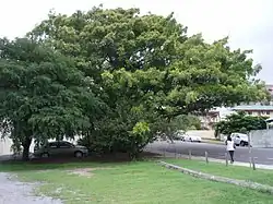 The Roseberry Street Fig Tree is a mature Ficus benjamina (weeping fig) situated in the grounds of the Government Offices in Roseberry Street, Gladstone. It has a height of 12 metres (39 ft) and a canopy spread of approximately 37 metres (121 ft) with a trunk circumference of 660 centimetres (260 in). The tree overhangs the road providing shade for cars parked along the street. Around the base of the tree is a small garden planted with shade loving shrubs which add to the aesthetic value of the place. A modern wooden seat has been placed underneath the deep shade of the tree and near this is located a plaque outlining the history of the tree and its connection to former prominent Gladstone citizens, James Friend and William Robert Golding. The tree dominates the streetscape with its obvious beauty, age and size and it has become a place of rest and conversation for those working in the immediate vicinity.[1]