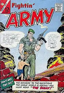 Fightin' Army was a bimonthly war comic published by Charlton Comics from 1956–1984[1] (though it was primarily a reprint title from 1978 to the end of its run). Telling fictional stories of the United States Army, it was a sister title of the other Charlton war comics Fightin' Air Force, Fightin' Marines, and Fightin' Navy.