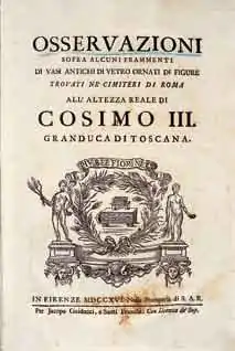 He is remembered most for his pioneering study of gold glass vessel bottoms used as grave-makers in the Catacombs of Rome, Osservazioni sopra alcuni frammenti di vasi antichi di vetro ornate di figure trovati nei cimiteri di Roma (1716),[6] in which he made the extraordinary, almost proto-Romantic assertion that the aesthetic crudity of early Christian art, often remarked by connoisseurs of Roman arts, had served to intensify the piety of the worshipper, an early expression of feeling for primitive art.[7]