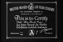 Film censorship in the United Kingdom began with early cinema exhibition becoming subject to the Disorderly Houses Act 1751.[1] The Cinematograph Act 1909 was primarily concerned with introducing annual licensing of premises where films were shown, particularly because of the fire risk of nitrate film.[2]:497 After the Act began to be used by local authorities to control what was shown, the film industry responded by establishing a British Board of Film Censors (BBFC) in 1912, funded by an Incorporated Association of Kinematograph Manufacturers levy.[2]:499