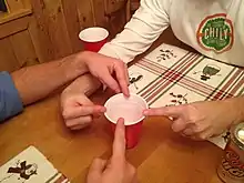 Fingers or finger spoof is a drinking game where players guess the number of participating players who will keep their finger on a cup at the end of a countdown. A correct guess eliminates the player from the game and ensures they will not have to drink the cup. The last person in the game loses and must consume the cup contents. The cup could be a pint glass, pitcher, or other vessel (large enough for all players to put one finger on the rim) that is filled with a sip or small sample of all players' own beverage prior to the start of the game.[1]