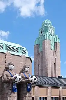 Helsinki Central Station lantern carriers dressed in national colours during the 2020 European Championships in 2021.