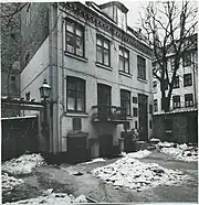 After Friborg's death, the property was passed to Lorenz Schultz, possibly a son from his second wife's first marriage. He continued the grocery business (as urtekræmmer). His property was home to 20 residents in three households at the 1840 census. Lorentz Schultz, a grocer (urtelræmmer), resided on the second floor with his wife Sophie Schultz (née Bernstein), one employee in his grocery business and one lodger (theology student).[12] Elisabeth Hagen (née Hall), widow of a ship captain, resided on the first floor with her three children (aged 20 to 25), her mother Maria Hall (née Phytzner), three lodgers (theology students) and one maid.[13] Niels Christian Bjørn, a captain in the King's Regiment, resided on the ground floor with his wife Gustave Valentin and their five children (aged nine to 23).[14]