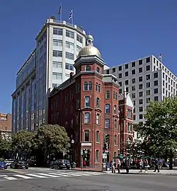 The Queen Anne-style building, at 303 Seventh Street, N.W., was completed in 1882. Rather than being built in a more elaborate Queen Anne style common throughout many of Washington's neighborhoods, this building has a more restrained look. Instead of a conical roof, deep detail on the façade, and a colorful exterior, the building has only a golden cupola and dome, and a red-brick exterior with muted detail. The structure was built to fit into the corner created by Indiana Avenue and Seventh Street. The Fireman's Insurance Company owned the building through the 1950s.[2]