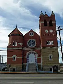 Fire destroyed the first frame church. Between 1910 and 1915, the church was rebuilt (now facing east, toward Ripley Street) under the leadership of pastor Stokes. Members of the congregation were asked to each bring a brick a day to build it—hence the church's nickname, the "Brick-A-Day Church."[6] The building was designed in the style of the Romanesque Revival by W.T. Bailey of the Tuskegee University.[7]