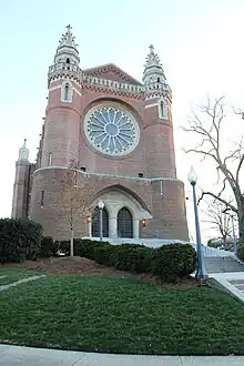 First Presbyterian Church was founded in 1824[1] and was the first chartered Presbyterian church in the city.[2][3] Four of its 12 original members were slaves. Thirty to 40 slaves were members by the time of the American Civil War, and after being freed, 37 former slaves started Saint James Presbyterian at Friendly Avenue and Church Street. Saint James is now located on Ross Avenue.[1] First Presbyterian Church has occupied four buildings in its history. The first three were located at Church Street and Summit Avenue north of the city center. The third building on that site, a Romanesque Revival style brick structure, now houses the Greensboro Historical Museum. In 1929 First Presbyterian Church moved into its fourth and current building, a Gothic Revival cathedral overlooking Fisher Park.[4]