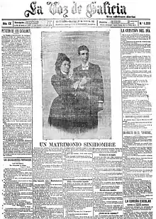 Finally, the neighbours could not remain indifferent as before, with what was at the moment known as "a marriage without a man".[4] The couple were exposed by Galician and Madrid newspapers and, as a consequence of this, both quickly lost their jobs, were excommunicated, and were issued an arrest warrant.[4] It appears that, so that the excommunication could take place, the parish priest requested a doctor examine Mario to check if he was a man or a woman.[5] Mario agreed. When the doctor issued his verdict, Mario attempted to pass for a hermaphrodite whose condition had been diagnosed in London.[5] The Civil Guard pursued the couple to the town of Dumbrías, where they both worked as teachers. There is evidence that they passed for Vigo and Oporto in their escape.[4] The last that is known of them is that they managed to board a ship destined for South America (possibly Argentina, as so many other Spaniards of the era),[4] where they spent their honeymoon and, finally, stayed to live.[6] One of the cases that one of the courts took against them was closed. Several years later, some residents of Dumbría spread a rumour about the death of Elisa and the subsequent marriage of Marcela to a man.[7] This rumour has not been confirmed.