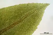 There are about 60 pairs of leaves that are slightly undulate (wavy) in texture.[3] The shape is oblong to lanceolate (narrow oval) and tapered to an acute point. Sometimes the leaf can be obtuse in shape.[3] The lamina also known as the leaf blade, is round and then narrows towards the apex.[3] The leaf margin is crenulate (finely scalloped) to regular serrulate (sawlike).[3] The marginal cells are often thinner with thicker cell walls.[3] There are about 2-3 cells in the costa.[3] The leaf cells are very turgid and irregularly round-like hexagons.[5] These leaf cells are unistratose which means they are single layered. They are also smooth and firm-walled.[3]