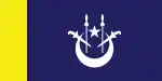 Flag of the BendaharaA blue flag with a yellow hoist, with a white crescent and star and two white kris and spears charged on the fly.