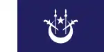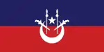 State and war ensignA blue field with a white crescent and star and two white kris and spears in a red canton.