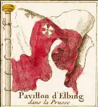 In 14th century, the city of Elbląg, as part of its allegiance to the Hanseatic League, begun using the banner that was horizontally divided into two fields, that were red and white, with each of the fields containing a cross pattée, that was of the opposite colour to the fields. Such flag was flown on the cogs of the Hanseatic League.[3] The red and white colours were inspired by the banner of the city of Lübeck, used since 13th century.[2]