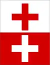 | Design | Rectangle divided horizontally into two stripes, white and red, with red stripe being slightly higher. In each stripe, to the left from the centre, is placed a cross pattée with triangular arms, that is of the opposite colour to the stripe |