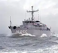In 1984, in occasion of the celebrations of the seven hundredth anniversary of the founding of Scheveningen, the Royal Netherlands Navy assigned the name Hr. Ms. Scheveningen to the minehunter numbered M855.[4] A coat of arms with two crossed herrings and the stork of The Hague was assigned to the ship. In response to some letters of protest sent to the newspapers, a petition and a parliamentary question, the Minister of Defence J. Rider,[5] was forced to change the coat of arms of the Hr. Ms. Scheveningen with the one with the crowned herrings. This story shows us how strong the feeling about the coat of arms is amongst the Scheveningen people, that this is their coat of arms and is part of their tradition.[2]