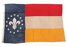 In 1915, Percival Chubb, Leader of the St. Louis Ethical Society, proposed that the city adopt an official flag. The Pageant-Drama Association held a contest with a $100 prize. In January 1916, they awarded the winning design to Edward A. Krondl, a young commercial artist.[4] Krondl's design featured an image of Saint Louis riding on a horse on a blue background, with orange and white stripes extending to the right. However, due to disapproval of Krondl's color scheme and his use of the fleur-de-lis, the city aldermen rejected Krondl's design and held a contest of their own. The winner of this contest, a man by the name of A.P. Woehrle, was announced in May 1916. Woerhrle's flag contained three stripes (red, white, and blue), in addition to stars on every corner and a shield containing Saint Louis in the middle. It was later discovered that Krondl had designed this flag as well, but had submitted it under the name of his friend Woehrle because he “wanted to win on merit and not the prestige gained by winning the previous contest.” The aldermen approved the design, but it wasn't until 1946 that the flag was officially recognized by a city ordinance.[5]