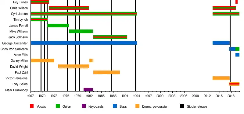 Flamin' Groovies is an American rock band that formed in San Francisco in 1965, originally co-led by Roy Loney and Cyril Jordan.[5][6] After the Groovies released three albums, on Epic (Supersnazz) and Kama Sutra (Flamingo and Teenage Head), Loney left the band in 1971. He was replaced as co-leader by Chris Wilson, and the band's emphasis shifted more toward British Invasion power pop.[7][8]
