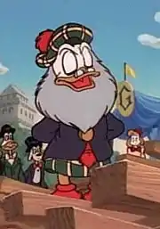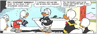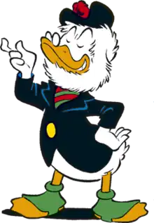 Flintheart Glomgold is a cartoon character created in 1956 by Carl Barks. He is a South African American Pekin Duck and the business rival of Scrooge McDuck, usually portrayed as an ambitious, ruthless, and manipulative businessman who shares many of the same qualities as Scrooge—the drive for massive wealth, and the cunning and creativity to obtain the same—but he lacks any of Scrooge's tendencies towards generosity and compassion.[1] In Don Rosa's The Life and Times of Scrooge McDuck, he is said to be a Boer.